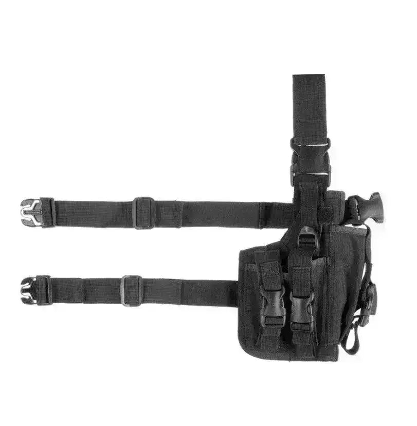 Adjustable thigh holster that fits a whole range of pistols. Holsters can be fastened in the belt and around the thigh so that it sits securely.