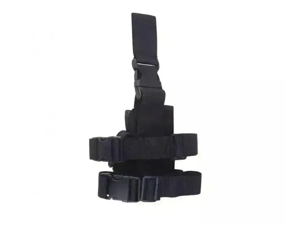 A thigh holster that attaches around the thigh and to the belt. Fits most pistols and can be adjusted somewhat. Magazine pocket for pistol magazine is integrated into the holster.