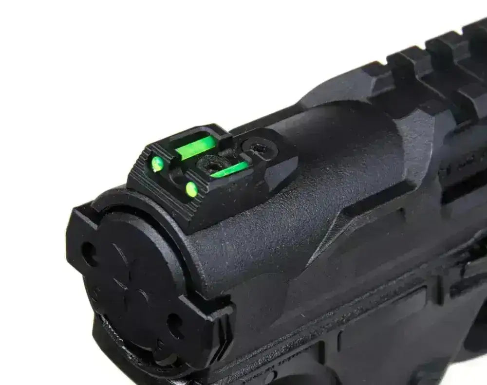 This stylish compact edition is equipped with a 21mm rail above and below for attaching optics and flashlight/laser.