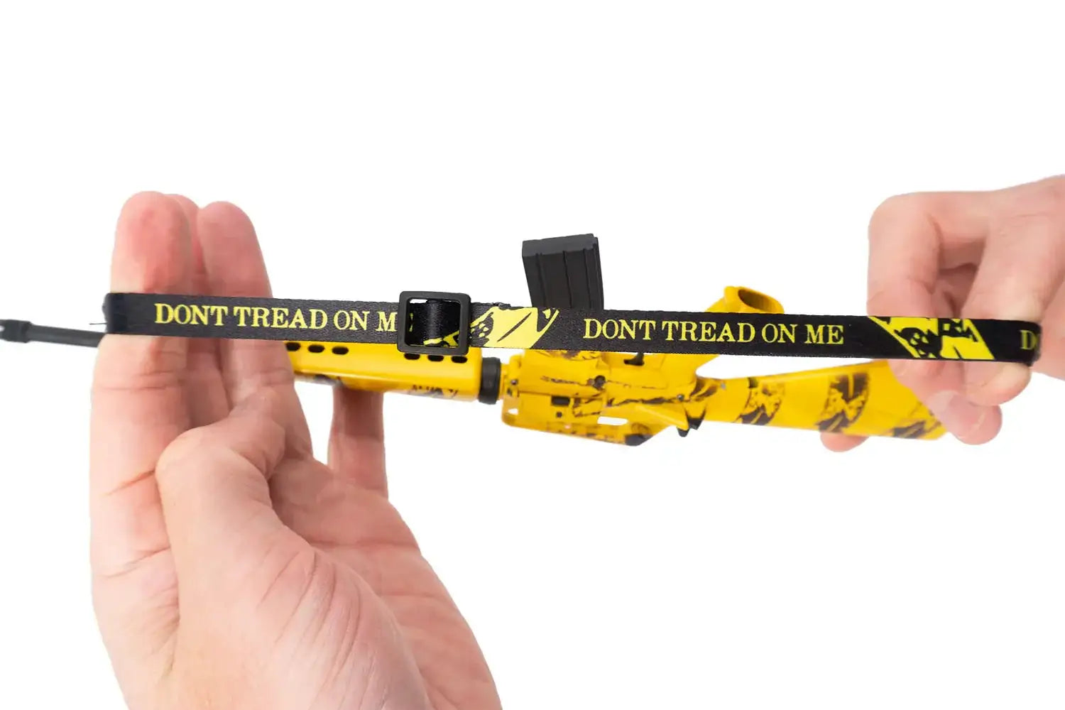 • Yellow and black carrying strap with "Don't Tread on Me" motif
