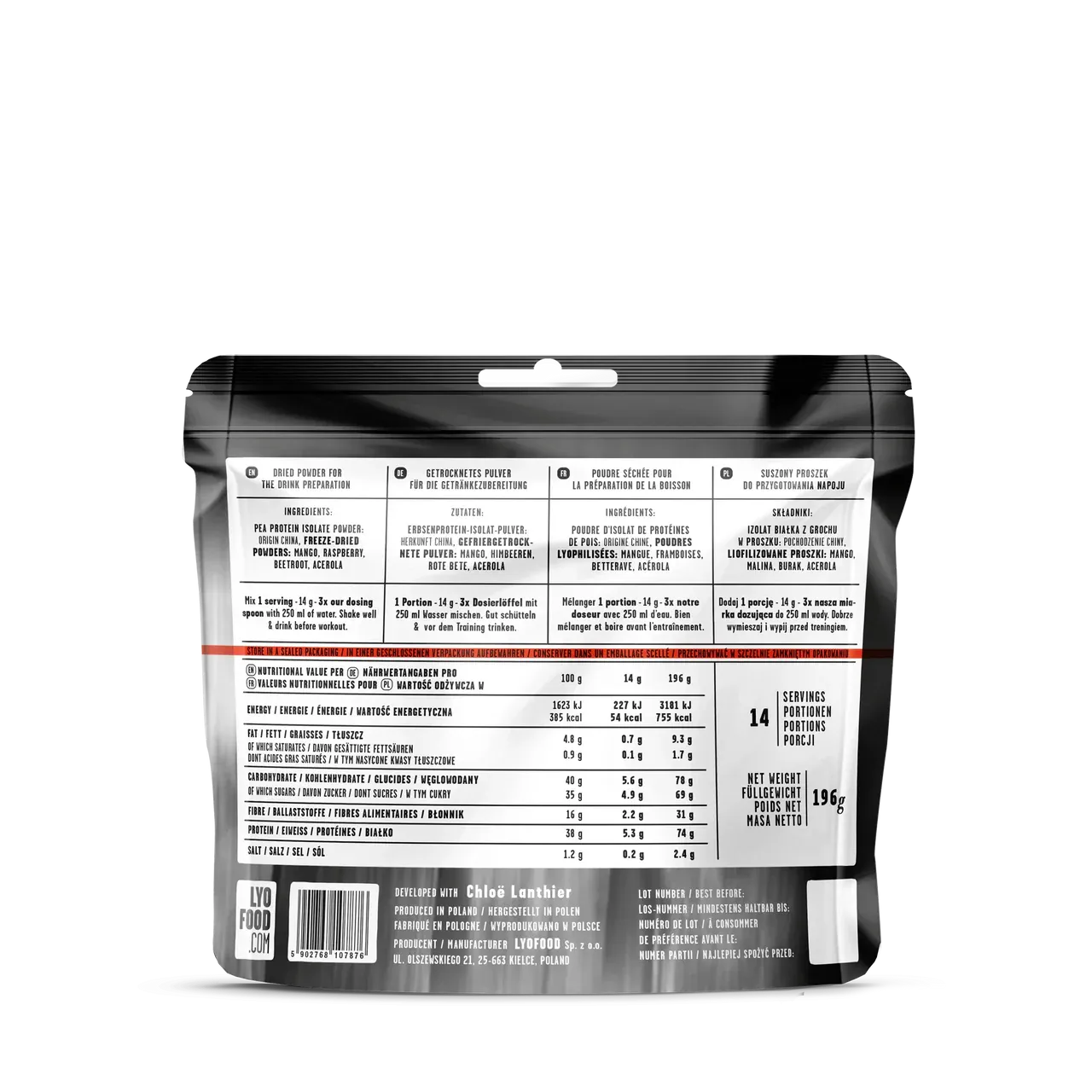 Pea protein isolate, freeze-dried mango, raspberry, beetroot, acerola