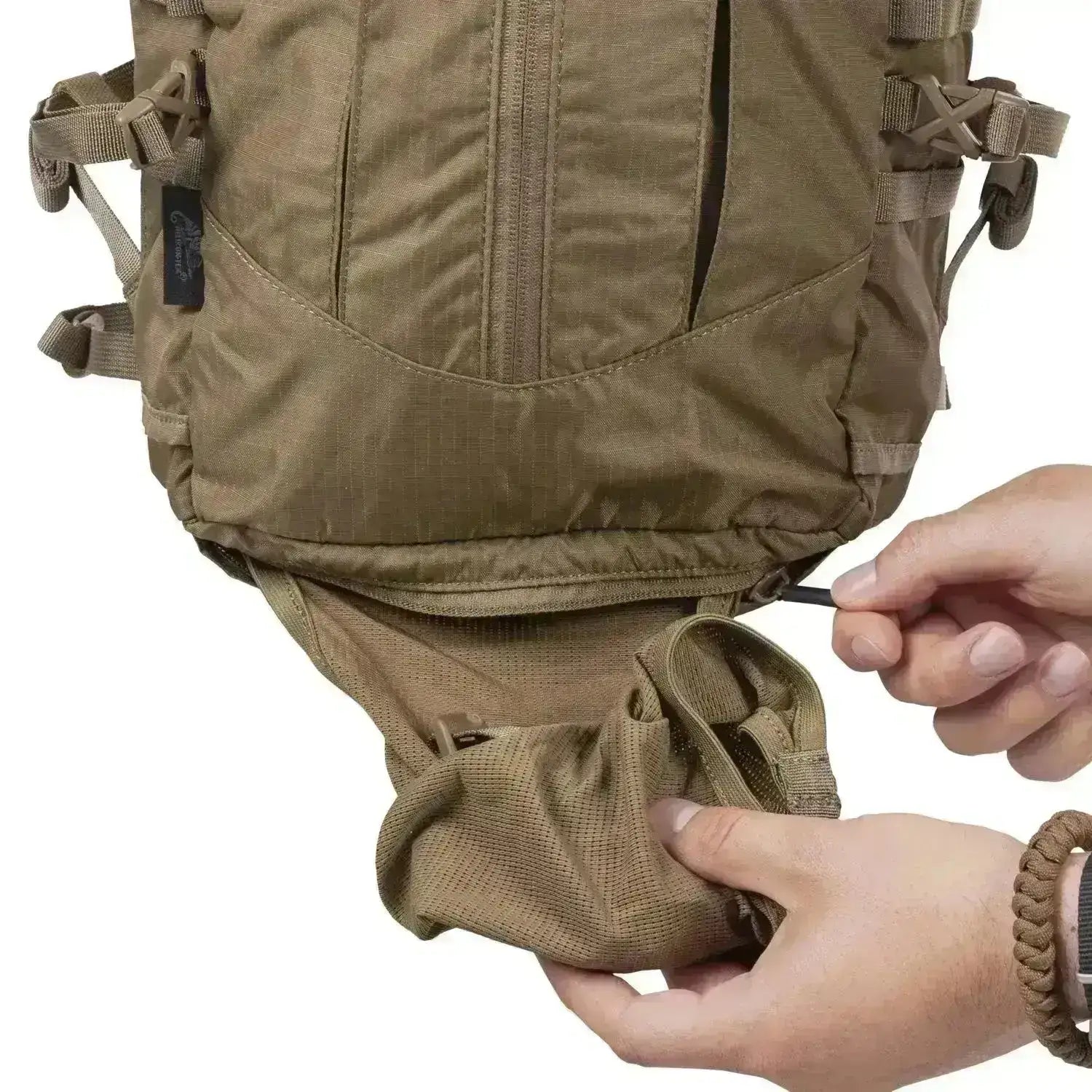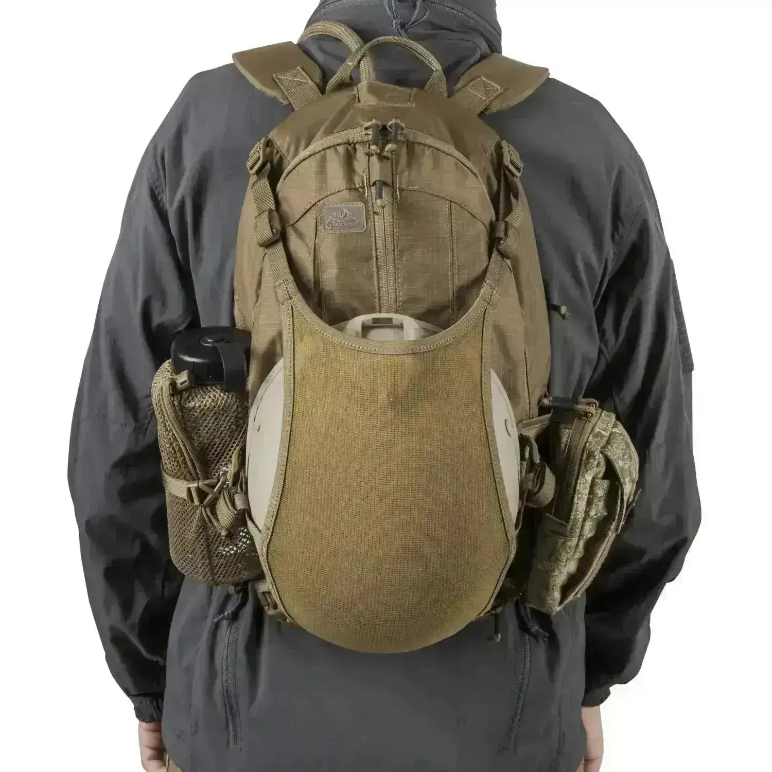On both sides of the backpack are two zippered pockets with additional mesh bottle holders, stabilized with a compression strap. Moreover, both sides of the backpack feature two rows of MOLLE Lite webbing, allowing for the attachment of extra pockets. The narrower width of the webbings also makes the backpack lighter.