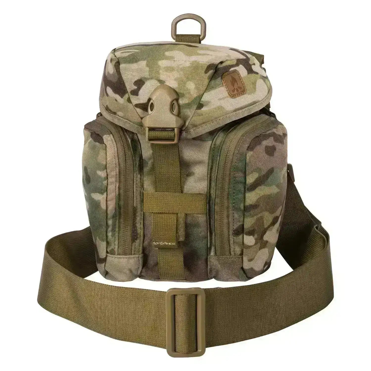 All gear is neatly organized in separate pockets. Essential Kitbag can be attached to a backpack or belt via MOLLE/PALS, or carried with its own shoulder strap. There is a compartment on the back that fits a foldable saw, knife, or axe.