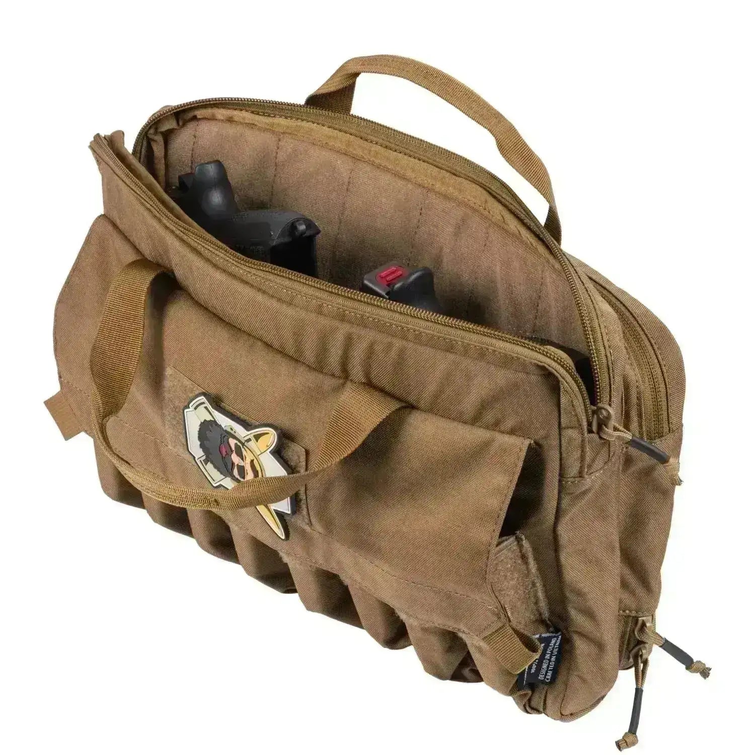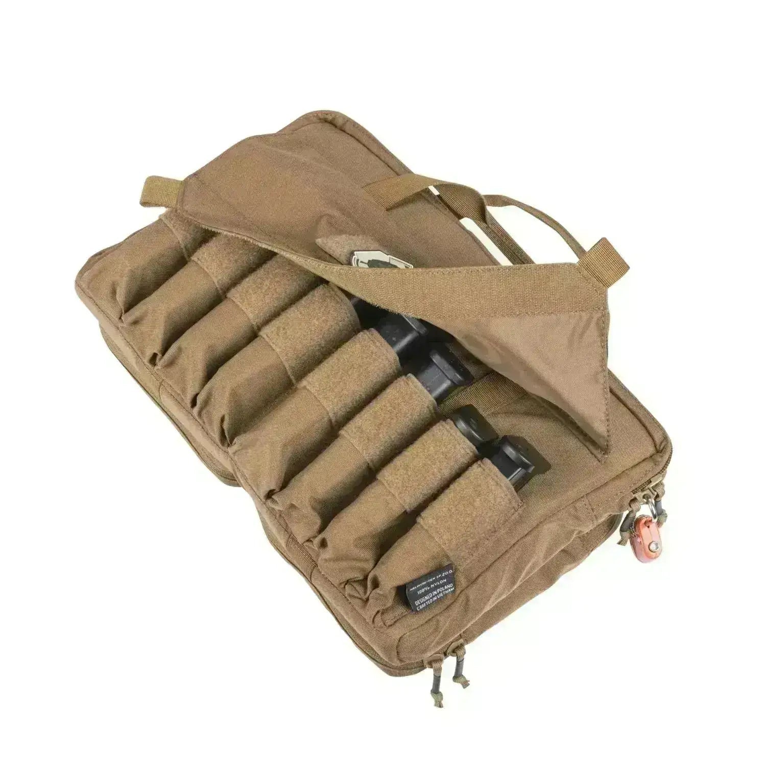 On the outside, there are two zippered pockets on one side – one for gear and one for cleaning equipment with an additional "dirty" section. On the other side, there are eight pockets for magazines that close with a simple Velcro flap. The bag is equipped with comfortable carrying handles.