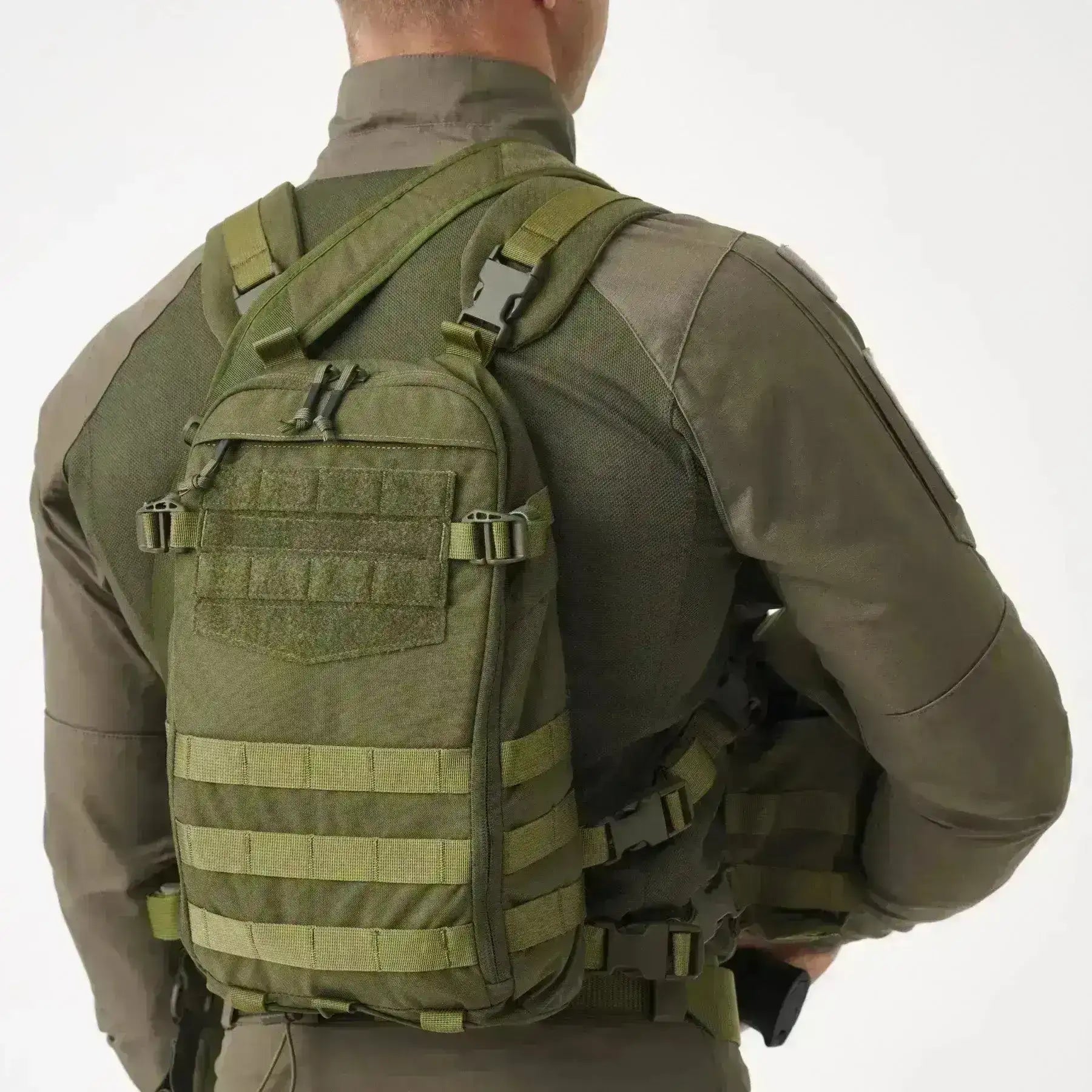 The straps are adjustable and can be completely removed. The backpack can be mounted directly onto a combat vest with MOLLE/PALS.