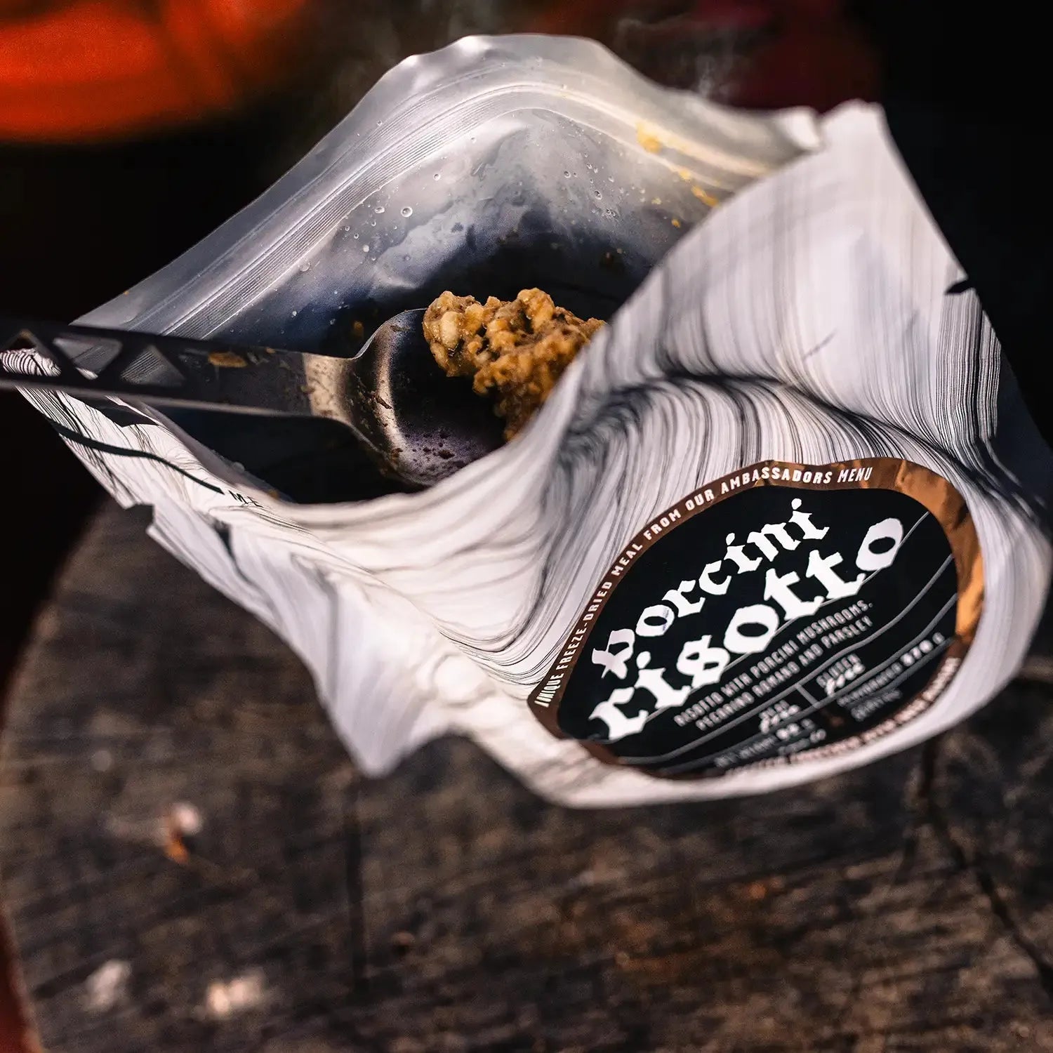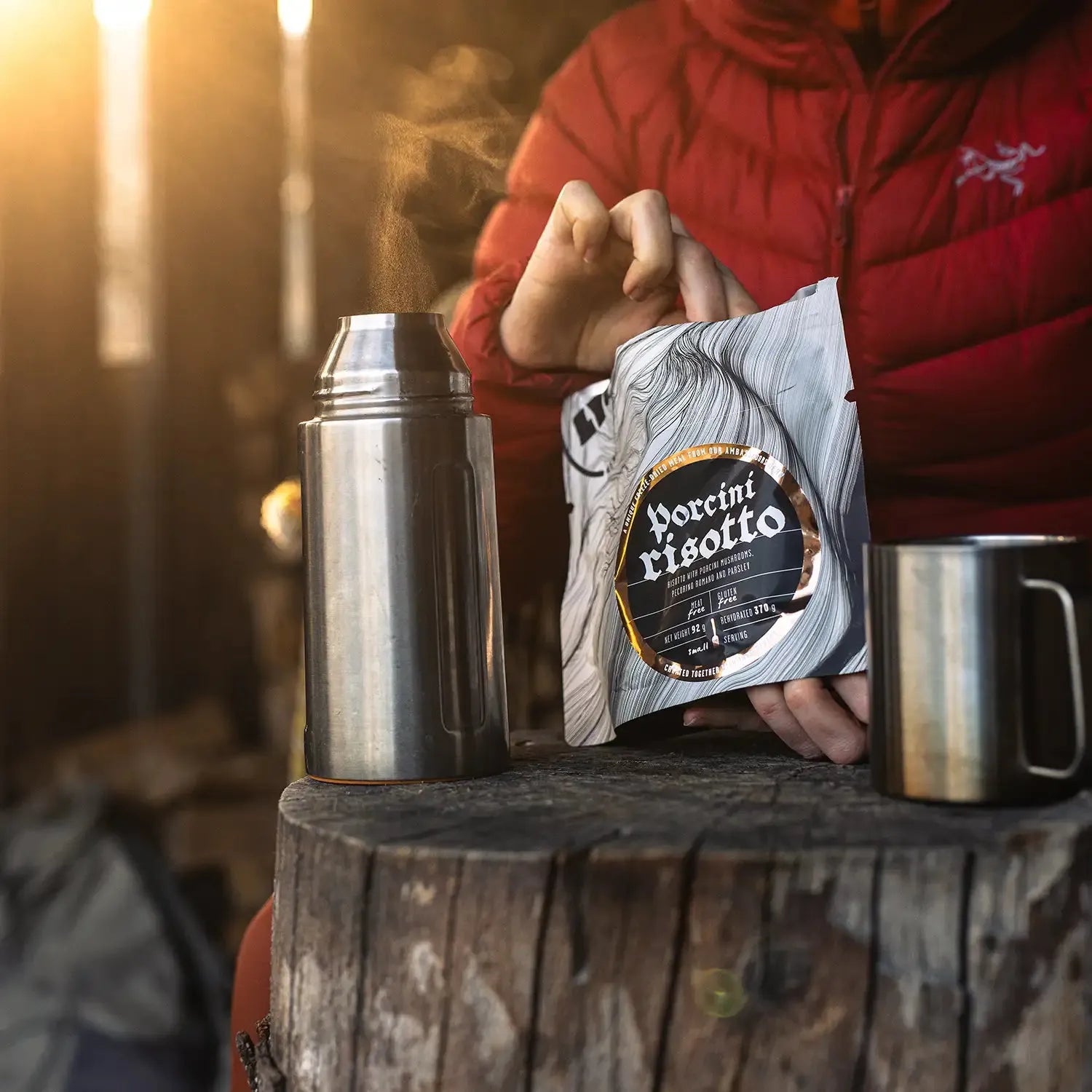 Specifications Weight (net) 90g Prepared weight 430g Servings 1 adult serving Shelf life Up to 5 years Benefits 100% natural ingredients – no preservatives Creamy risotto with the taste of porcini mushrooms and herbs Rich flavor, low weight – perfect for hiking meals Long shelf life and quick preparation Nutritional content (per 100g dry product) Energy: 1803kJ / 432kcal Fat: 17g (of which saturated fat: 7g) Carbohydrates: 55g (of which sugars: 5g) Fiber: 2g Protein: 11g Salt: 2.3g Ingredients