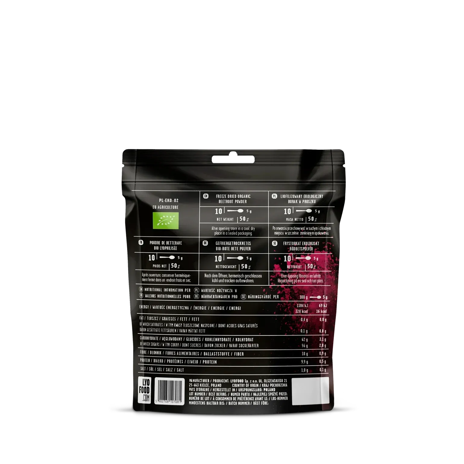 Specifications Weight (net) 50g Origin Poland Ingredient Organic beetroots (100%) Shelf life Up to 2.5 years Benefits 100% organic beetroots – no artificial additives Naturally rich in fiber, iron, and antioxidants Provides natural color and flavor to smoothies and baking Lightweight, compact, and long shelf life Nutritional content (per 100g powder) Energy: 1400kJ / 335kcal Fat: 1.2g (of which saturated fat: 0.1g) Carbohydrates: 66g (of which sugars: 8g) Fiber: 19g Protein: 10g Salt: 0.02g Ingredients