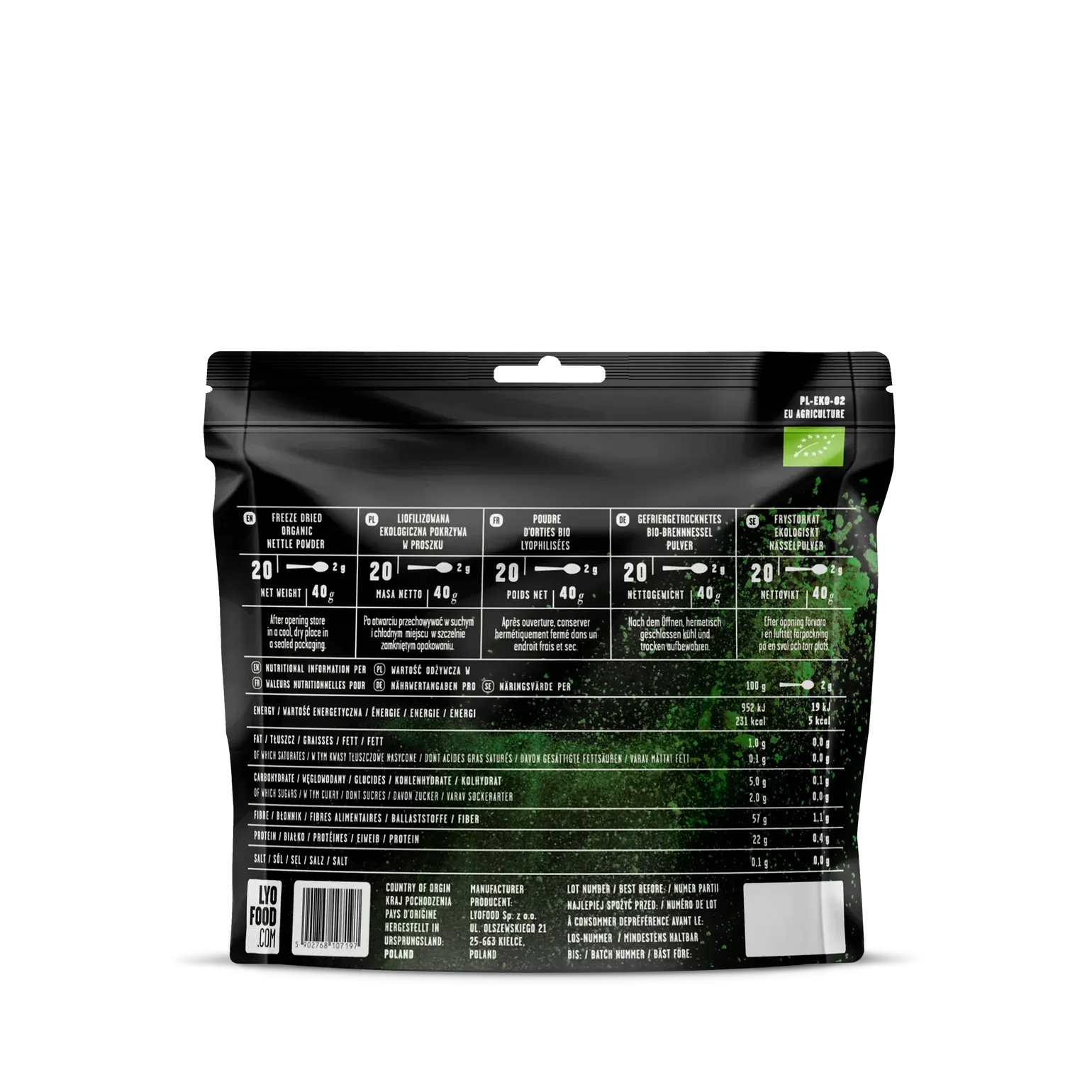 Specifications Weight (net) 50g Origin Poland Ingredient Organic nettle leaves (100%) Shelf Life Up to 2.5 years Benefits 100% organic – no artificial additives Naturally rich in iron, calcium, vitamin C, and fiber Easy to add to smoothies, soups, and baking Lightweight, compact, and with a long shelf life Nutritional Content (per 100g powder) Energy: 1150kJ / 275kcal Fat: 2g (of which saturated fat: 0.3g) Carbohydrates: 20g (of which sugars: 5g) Fiber: 40g Protein: 30g Salt: 0.02g Ingredients