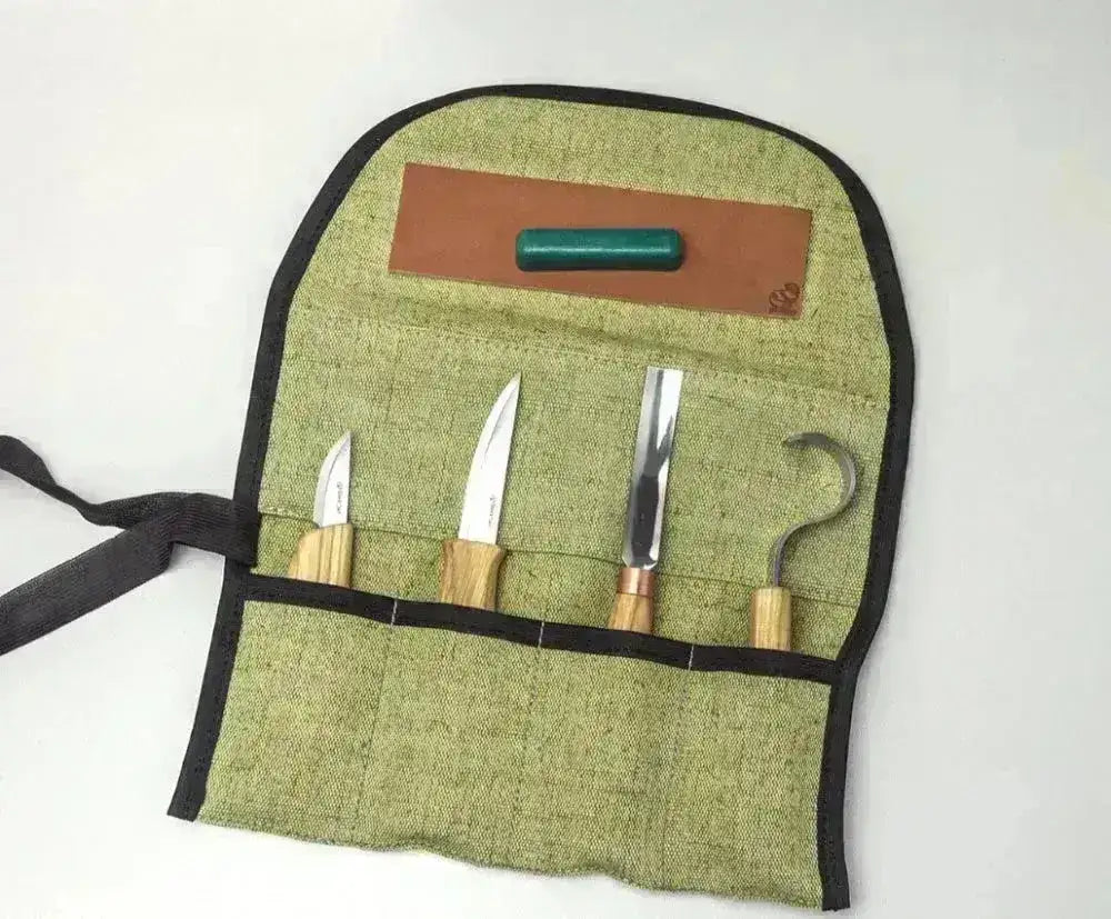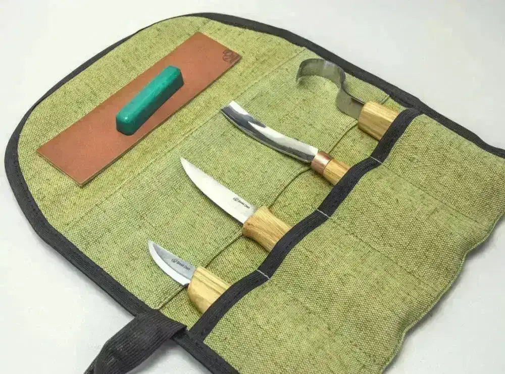 The set comes with three precision tools: a hollowing knife, a universal carving knife, and a detail knife – all made with razor-sharp carbon steel blades and comfortable wooden handles. Everything is safely stored in a sturdy roll-up case made of genuine leather, ready for use at home, in the workshop, or on the go.