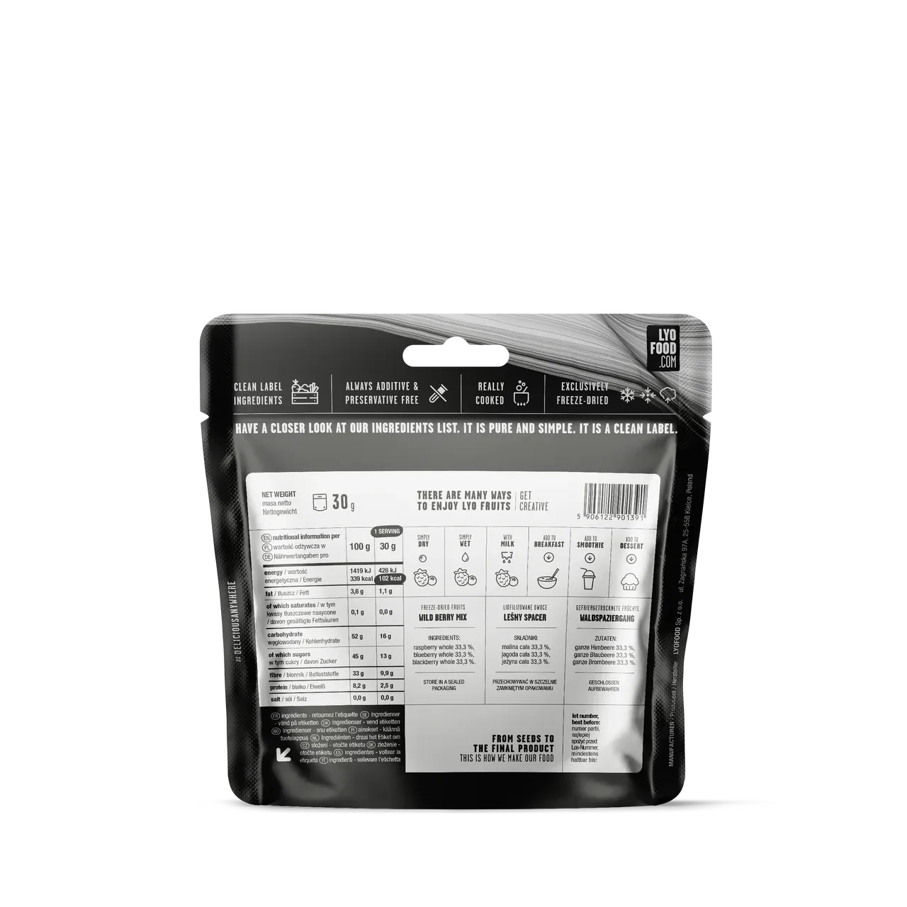 A fruity mix of raspberries, blueberries, and blackberries – perfect as a snack or added to cereal, smoothies, and desserts. LYOFOOD Wild Berry Mix is made without added sugar and preservatives, just 100% natural berries. Crispy and flavorful straight from the bag, or rehydrated with water or milk.