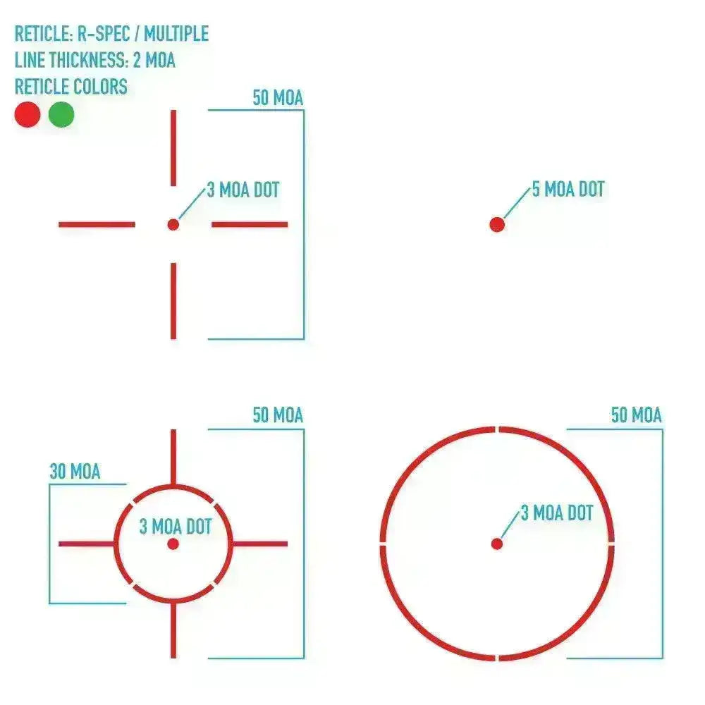 Wide-angle scratch-free lens giving you a long-lasting lens. Lightweight 6061-T6 aluminum frame and body which ensures that the optic can withstand a little beating. The optic is shockproof, dustproof, waterproof (IP55) and is recoil tested up to .50Cal