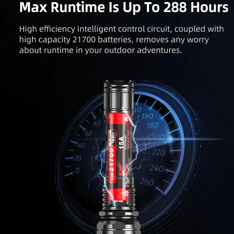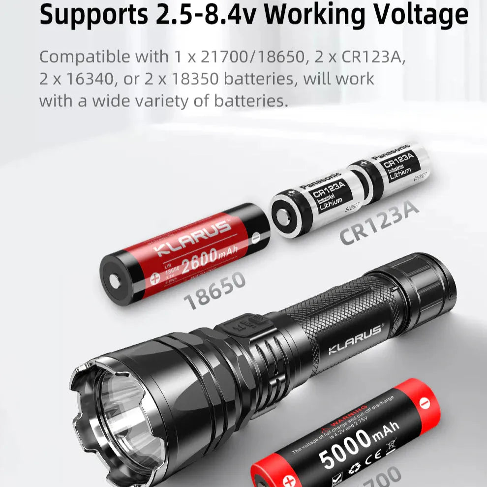 Utstyrt med one-touch aktivering, kan du raskt bytte mellom lysmoduser for optimal synlighet. Lommelykten støtter et bredt spenn av spenning fra 2,5V til 8,4V, noe som gjør den kompatibel med flere batterityper, inkludert 18650 og 21700 oppladbare batterier.