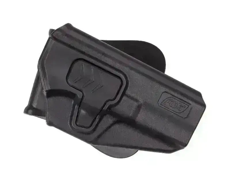 Saque su arma rápidamente con esta funda de polímero moldeado. la pistola se bloquea automáticamente en su lugar cuando está enfundada y se puede sacar rápidamente gracias a un botón de gatillo agrandado. La funda viene con un accesorio para cinturón y se puede girar 360° para que obtenga el ángulo que más le convenga. La parte posterior de la funda está recubierta de goma, lo que ayuda a que se ajuste cómodamente a la cadera.
