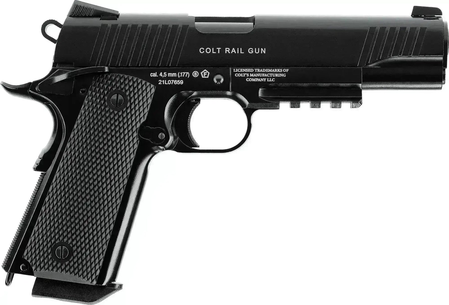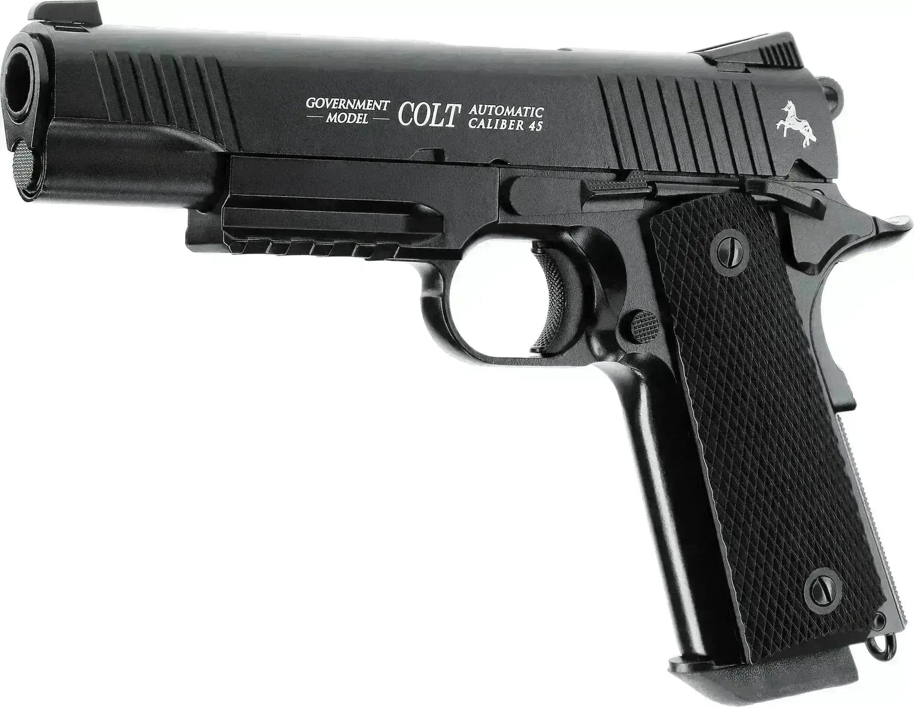 Réplica de pistola de aire comprimido Colt con licencia completa. Esta versión CQBP de la pistola es una versión más modernizada del buen clásico 1911, donde el marco viene con un riel de 21 mm para montar una linterna o láser, además, se han mejorado las miras delantera y trasera.
