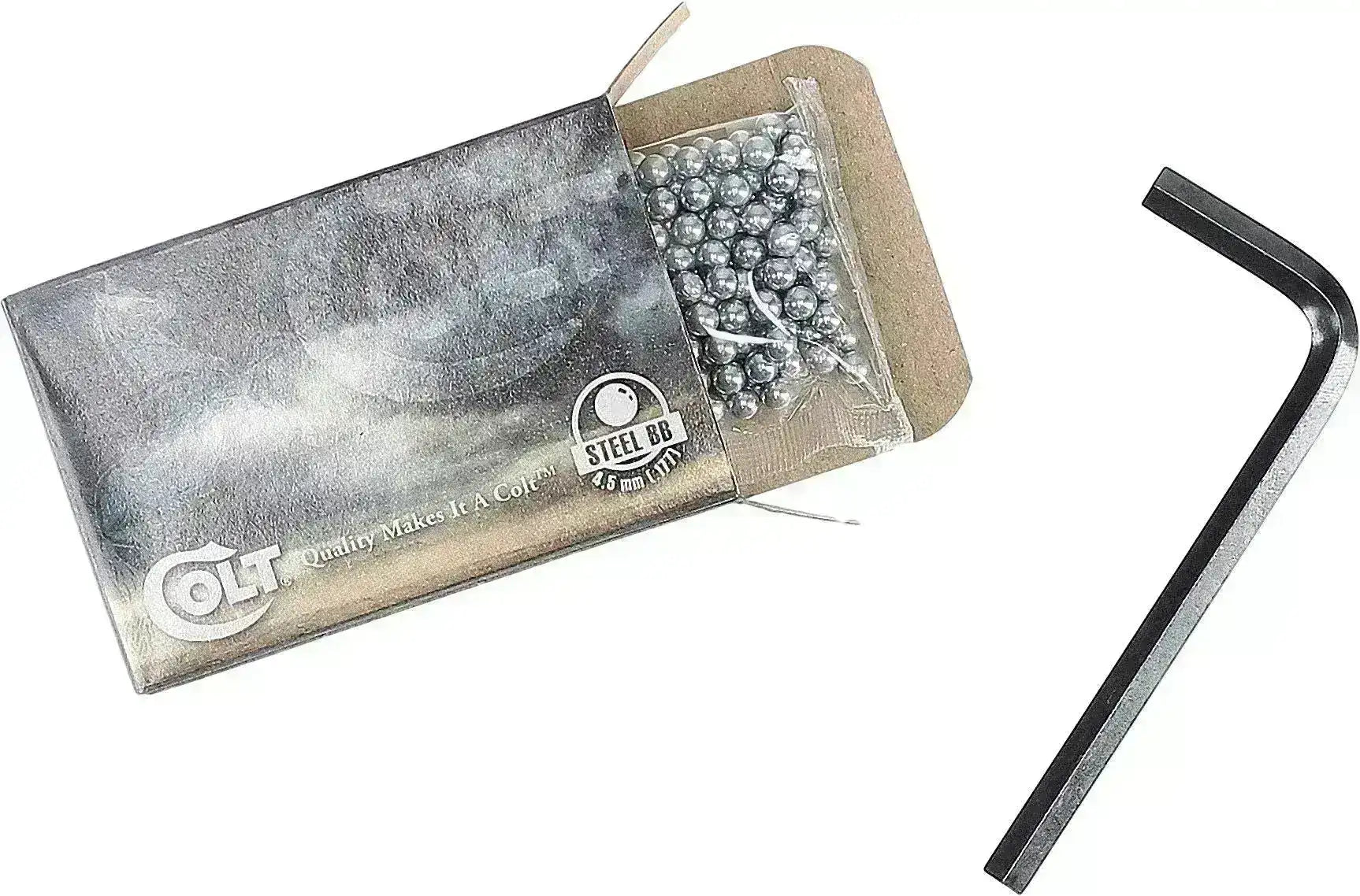 Esta versión de pistola de aire comprimido dispara balas redondas (bb) y es una bonita réplica con marcas originales. La pistola está fabricada por Umarex bajo licencia de Colt. Además, viene con un retroceso bueno y contundente que ayuda a llevar el realismo a otro nivel. La pistola está hecha completamente de metal, lo que le confiere un buen peso de casi 1 kg (930 g). Gracias a la mira de combate de la pistola, es fácil apuntar con ella.