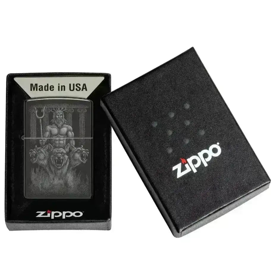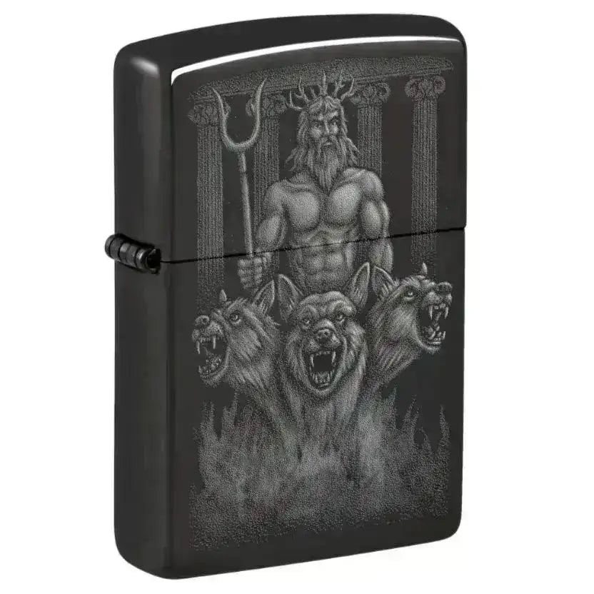 Estupendo encendedor Zippo en color High Polish Black con un impresionante diseño que muestra a un dios poderoso flanqueado por perros guardianes. Este encendedor fiable y elegante es un artículo funcional y decorativo, ideal para el uso diario o como regalo.