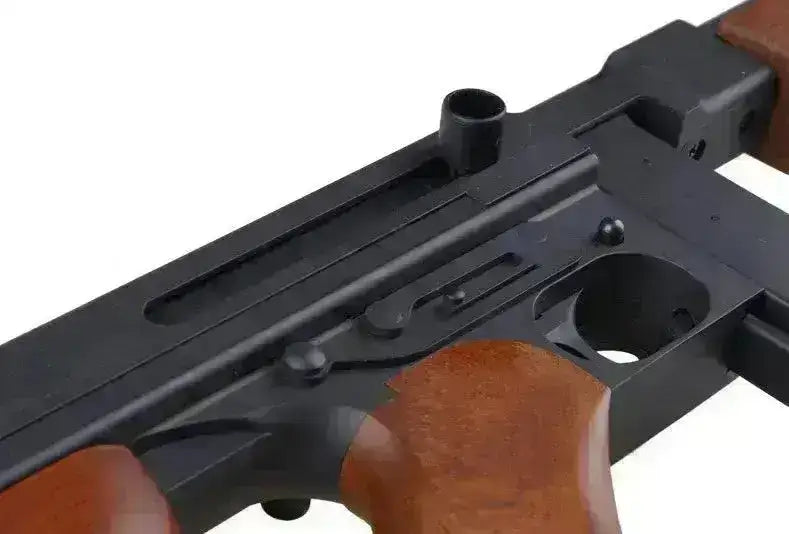 Este icónico rifle SMG de airsoft es bien conocido por su papel en las películas de mafia y en los juegos. El Thomson M1A1 vio la luz en 1917, hacia el final de la Primera Guerra Mundial. Este rifle está hecho de acero, aleación de metal y ABS. El cuerpo, el cañón y las miras están hechos de metal. Mientras que la culata, el guardamanos y la empuñadura de pistola están hechos de plástico ABS. buena calidad, con elaborado Imitación madera. El soporte para correa y la cubierta del cargador reciben mucha atención. desgaste de las partes exteriores, por eso están fabricadas en acero.
