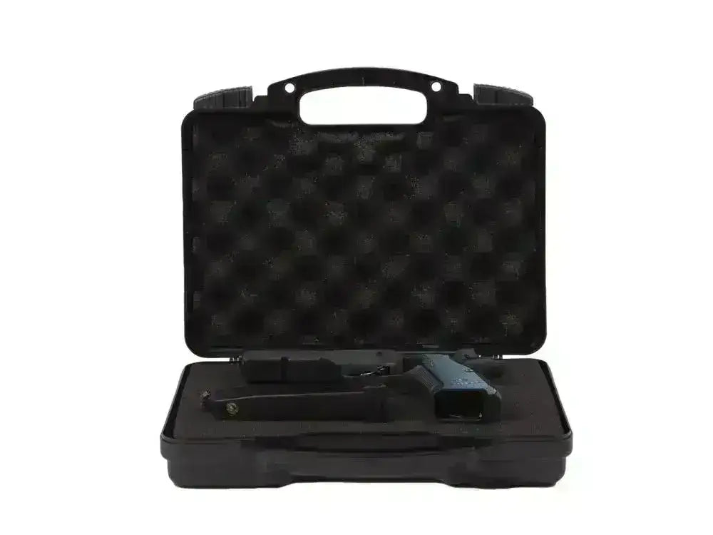 Un práctico estuche para armas con espuma suave en el interior que mantiene todo estable y seguro en su lugar. La maleta tiene una carcasa de plástico duro con un asa de transporte. La maleta es apilable.