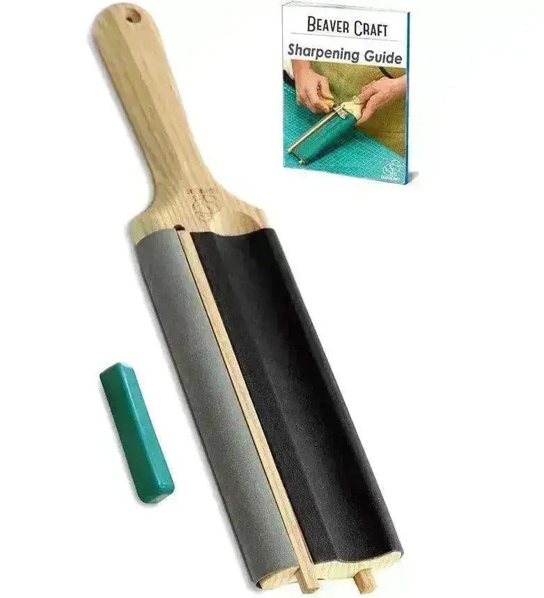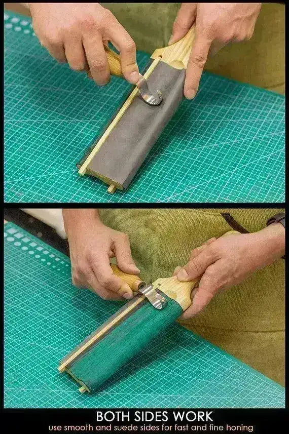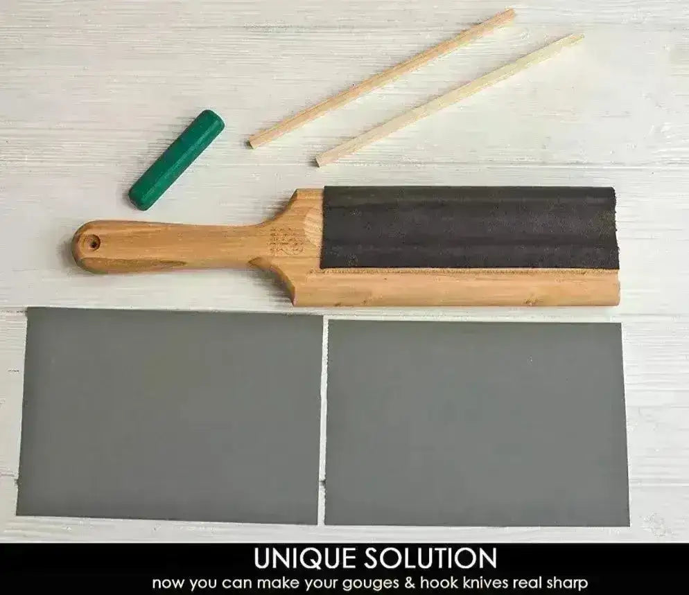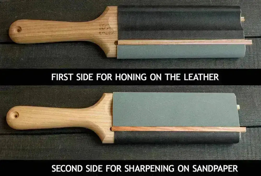 Un lado del bloque es de cuero y el otro es papel de lija. Se incluyen pasta de pulido verde y gris, así como un manual de usuario para que puedas pulir y mantener los cuchillos a la perfección.