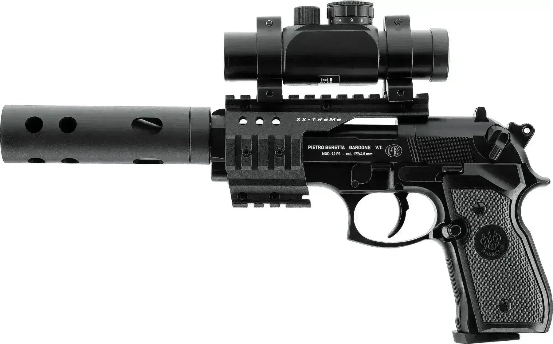Fabricada bajo licencia por la propia Beretta, esta réplica del M9 es un placer para disparar. Los disparadores de acción simple y doble combinados con un cañón de acero estriado proporcionan una precisión excelente y el arma viene con un riel de montaje para un punto rojo y una mira de punto rojo. Moderador incluido.