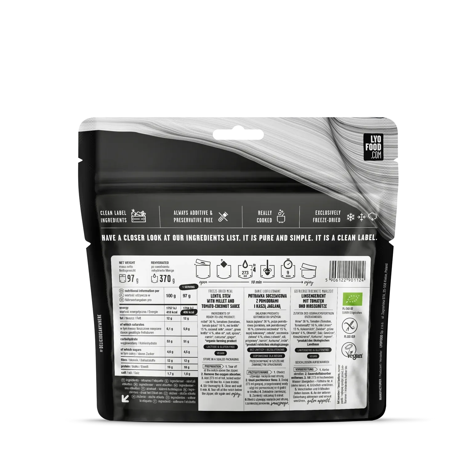 LYOFOOD Indisk Linsedal gir deg en aromatisk og næringsrik rett basert på røde linser, kokosmelk og ekte indiske krydder. Perfekt for deg som ønsker et vegetarisk og melkefritt alternativ på tur. Frysetørket for ekstremt lav vekt og lang holdbarhet – klar for ekspedisjoner, camping og eventyr i villmarken.
