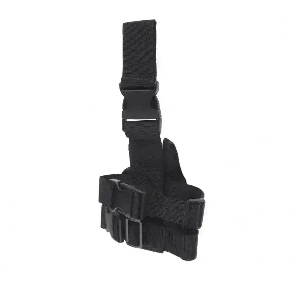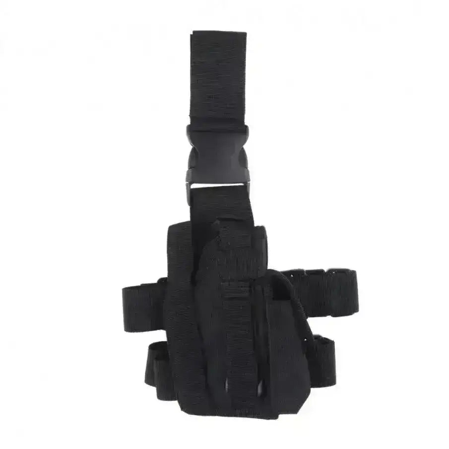 Una funda de muslo que se fija alrededor del muslo y al cinturón. Se adapta a la mayoría de las pistolas y se puede ajustar un poco. El bolsillo para cargador de pistola está integrado en la funda.