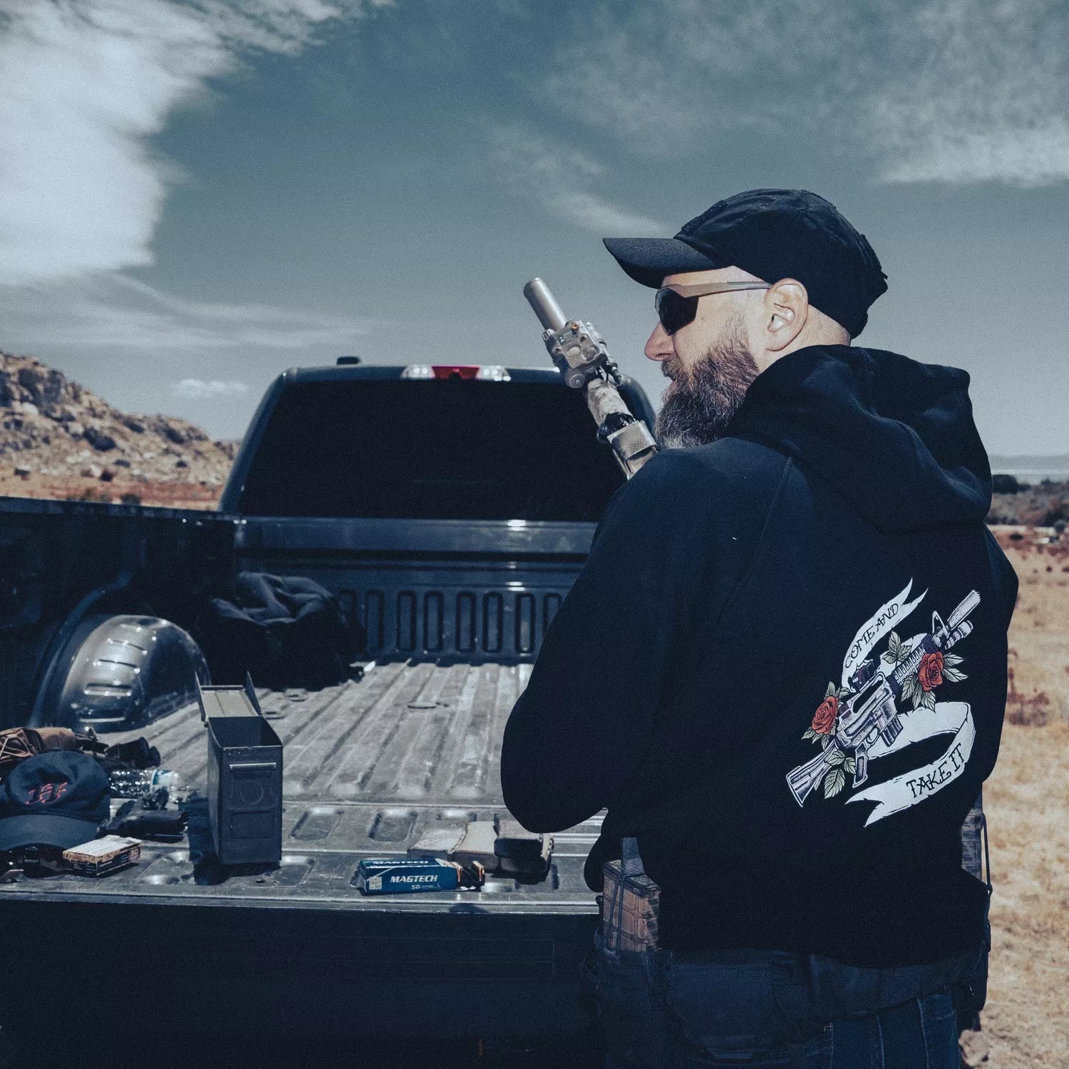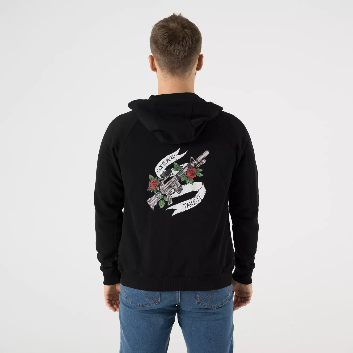 Trykket «Come and take it» viser til et historisk slagord knyttet til motstand og stahet. Uttrykket har røtter i antikken (ofte knyttet til uttrykket molon labe) og ble senere kjent fra Gonzales-flagget under Texas-revolusjonen i 1835. I dag brukes teksten mest som et kulturelt og historisk nikk, her i en nedtonet, grafisk utgave som ikke dominerer genserens uttrykk.