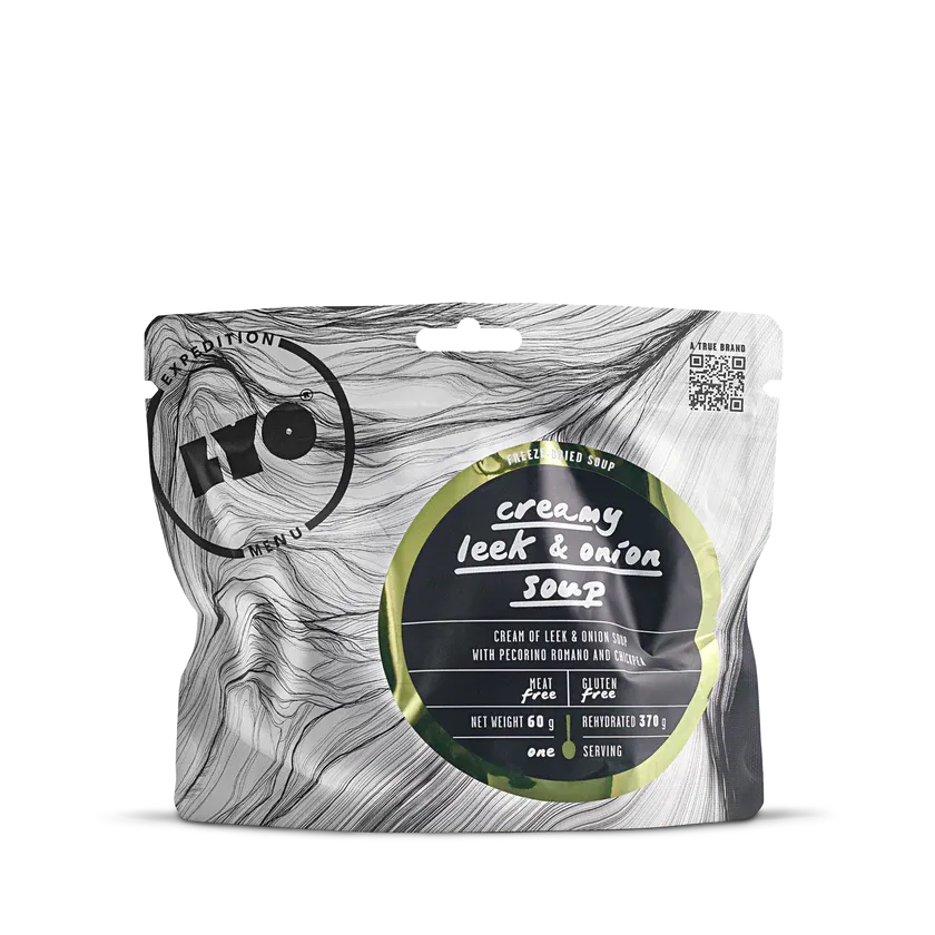 LYOFOOD Creamy Leek & Onion Soup – Gluten-Free Creamy Soup for Hiking Warm, mild, and nutritious – ready in minutes LYOFOOD Creamy Leek & Onion Soup combines mild leeks and onions in a creamy, warming soup. Made from 100% natural ingredients, completely free of gluten or artificial additives. This light meal soup is perfect as dinner, a snack, or an appetizer on mountain hikes, expeditions, or camping trips.