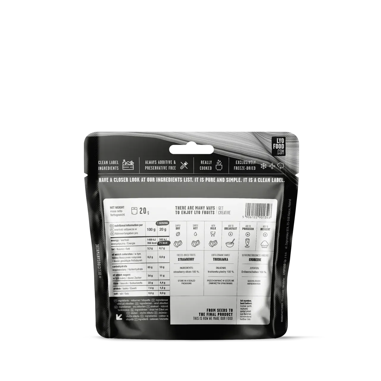 These freeze-dried strawberries from LYOFOOD are made from 100% fresh strawberries, with no added sugar, preservatives, or additives. Enjoy them as a snack, mix into breakfast, smoothies, desserts – or make your hiking wine more festive. Perfect for outdoor activities, baking, and as a natural snack.